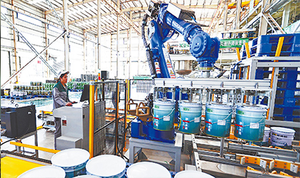 近日,在位于萬載縣的江西涂聯(lián)綠色新材料產(chǎn)業(yè)園,工人操控機械臂裝載和搬運綠色涂料產(chǎn)品。該產(chǎn)業(yè)園引進...